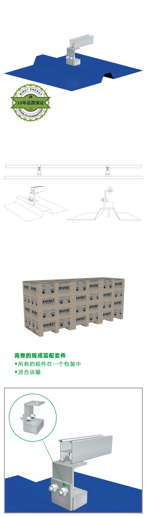 MRac 防水支撐座 主結構材質鋁合金,通過專業(yè)的設計讓支撐座與T形彩鋼瓦的完美銜接,獨特的防水結構設計讓您不必因為安裝而造成屋頂滲水的煩惱,實現(xiàn)您對安裝和保護屋頂?shù)囊?。因地制宜的設計方案和優(yōu)良的結構強度計算,幫您最大程度上降低工程的安裝時間和安裝成本,專利配件的獨特設計,帶給您更多的快捷安裝體驗。